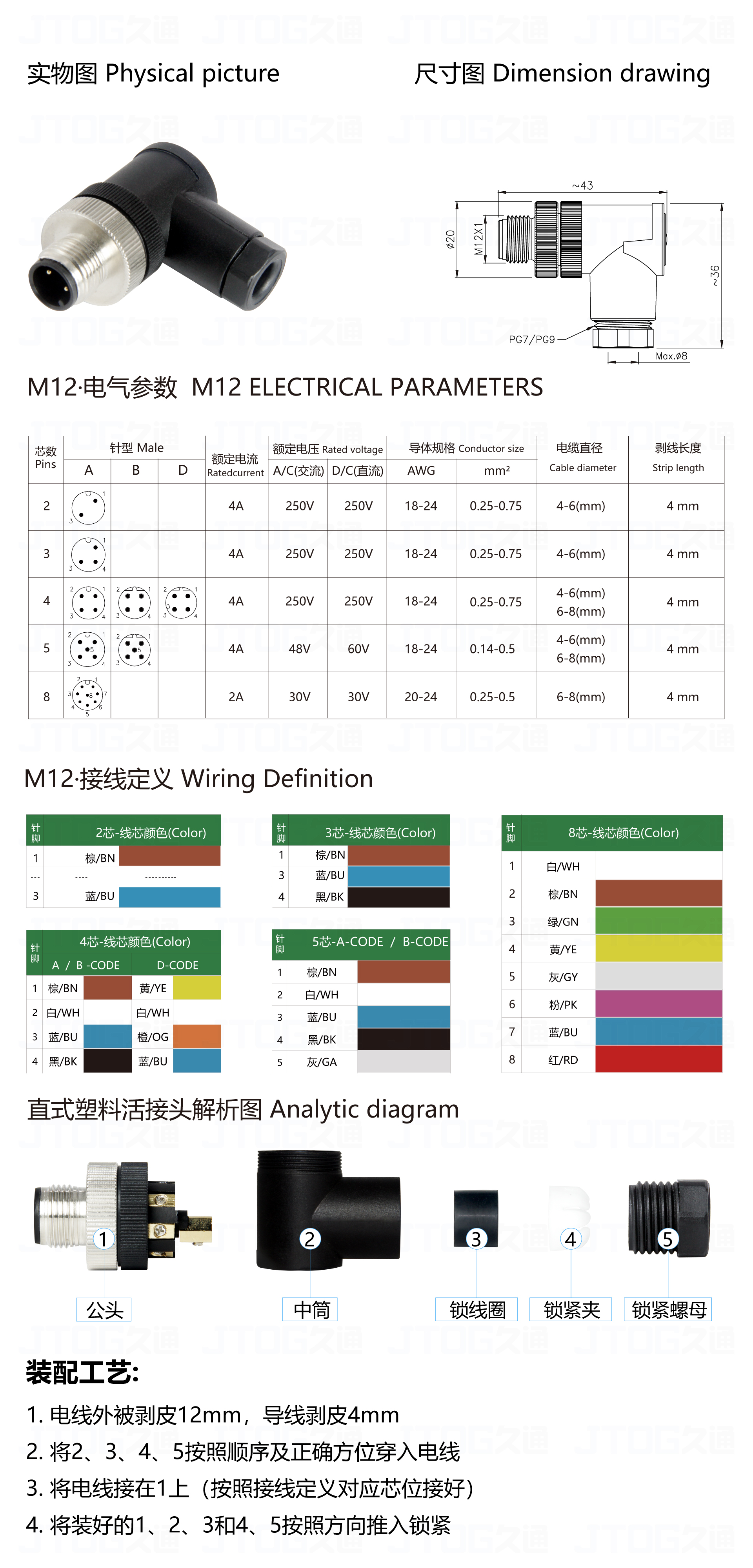 公头 Male M12弯式塑胶组装式 螺钉款(公头)